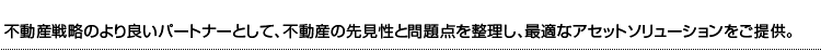 | 「会計制度のグローバル化」「不動産価値や金融環境の変化」など、不動産をとりまく環境のめまぐるしい変化にどう対応すべきか。 不動産の有効活用に対して、最適のプランをご提案(Architects)し、それを実現する行動(Action)と、的確なアドバイス(Advice)によって、不動産価値を最大限に高める、解決サポート(Asset Solution)をご提供。それが、私たちPART Aがお客さまへ果たすべき役割(PART)であり、めざすべきビジネスコンセプトでもあります。 英語も日本語も「A(あ)」から始まり、他の文字と組み合わさることにより変化していきます。PART Aも、「A」のごとく、プロジェクトの初めからその本質を的確に捉え、より価値のあるものへと変化させていきます。 |